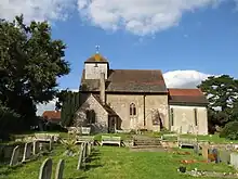 The little parish church of St. John the Baptist is an Anglo-Saxon church that has a squat bell turret of shingles with a wrought iron weather vane dated 1781. The church has some magnificent wall murals, for example the Last Judgement, from the mid-12th century (11501200). These murals, unique in England for their date and extent, were first brought to light during repair work in 1893 and were probably painted by artists from St Pancras Priory in Lewes.[4][5] Sir Norman Hartnell, who designed Queen Elizabeth II's wedding gown and coronation dress and served as couturier to Elizabeth II (and previously to The Queen Mother) is buried in the churchyard.