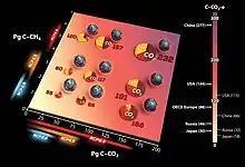 Nine probable scenarios of greenhouse gas emissions from permafrost thaw during the 21st century, which show a limited, moderate and intense CO2 and CH4 emission response to low, medium and high-emission Representative Concentration Pathways. The vertical bar uses emissions of selected large countries as a comparison: the right-hand side of the scale shows their cumulative emissions since the start of the Industrial Revolution, while the left-hand side shows each country's cumulative emissions for the rest of the 21st century if they remained unchanged from their 2019 levels.[140]
