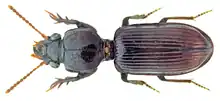 | Family: Carabidae Size: 5,5 mm Location: Kenya, Tsavo National Park, Voi Lodge, 550 m leg. U.Schmidt, 25.XI.1991; det. P.Bulirsch, 2011 | |