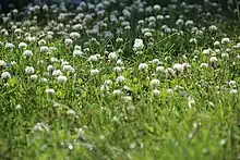 White clover, commonly used in clover lawns, attracts pollinators and can have a beneficial effect on local nectar production. It is also a nitrogen fixing plant. White clover is able to withstand damp environments and can be desirable in areas prone to flooding.[1] It also functions as groundcover and can reduce a homeowner's reliance on fertilizer, leading to its desirability among environmentally conscious consumers.[7] To maintain a height of about 3 to 4 inches, it can be mowed every four to six weeks.[8] Other homeowners allow the clover to grow taller and only mow it a few times a year.[4] Clover is also more robust in alkaline soils than grass. A technique, when clover is preferred to grass, is achieved by adding lime to the soil to encourage the clover to dominate the lawn.[9] Research conducted in Iran and former usage shows that either alone or mixed with grass it is more resistant to heat and requires less water to be maintained.[2][10]