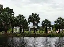 The site also showcases landscape roses, native plants of the state of Georgia, and seasonal annuals and educational displays. A 50,000-gallon water garden was completed on the shores of one of the site's lakes in 2012. In 2013, a Mediterranean-style garden was completed in the area by the Bridal Cottage and Conference Center, historically the original entrance to the property when it was a USDA plant-introduction station. In 2015, the new Andrews Visitor and Education Center opened and is the point of entrance for all visitors from the improved and landscaped Canebrake Road entrance drive. Four other gardens were completed in 2015, too. The Woodland Shade Garden offers picturesque views over a chain of lakes, the White Garden boasts three magnificent white pergolas surrounding a lawn and the Formal Garden features four parterres surrounded by olive and white crape myrtles. The Georgia Trustees Garden replica—the agricultural plot began by James Oglethorpe and existed from 1733 to 1755—also was laid out and features edible, medicinal and crop commodities the first settlers to the Georgia colony were expected to produce. Such items included mulberry leaves for silkworms, as well as grapes, pomegranates, stone fruits, cotton, sesame, hops, and sour oranges. In 2016, the Sun Garden was created and is continually receiving new plants to add to this expansive area.