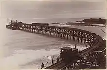 Over the life of the port, there were three jetties. The second jetty was destroyed by a storm, in 1974, and replaced with a jetty of concrete and steel construction.[124]