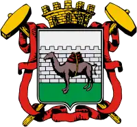 The coat of arms of Chelyabinsk (Russian: Герб Челябинска, romanized: Gerb Chelyabinska) is the official municipal coat of arms of Chelyabinsk, Russia. The current design, adopted on 12 September 2000 by the City Duma, features a gold camel loaded with goods on its back. The shield is divided into two fields, with the top being taller than the first. The top field is silver and is designed to resemble a brick wall. The bottom field is green.