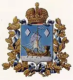 The coat of arms of the Łomża Governorate depicted a small orange (golden) Kaffenkahn river boat with four paddles, a white (silver) sail and a naval jack on top of the mast. On each side of the boat, on the height of the mast, was placed a grey (silver) rhombus. The boat was put on a body of water. It was placed on a blue French-style escutcheon. Around the shield, there were yellow (golden) leaves of the oak tree, interspersed with the blue ribbon of the Order of St. Andrew. On the top of the coat of arms, above the escutcheon, there was the yellow (golden) Imperial Crown of Russia. The coat of arms was used until 1912, when the governorate ceased to exist.[2][4]