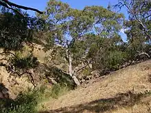 The park lies on the border between the dry northern Adelaide Plains and the wetter Mount Lofty Ranges. Based on climate measurements for nearby Parafield Airport, the park has an average rainfall of 465 millimetres (18 in), an average winter daily temperature range of 6.2—15.6 degrees Celsius and a summer range of 16.5—29.7.[7] Due to the risk of flooding after heavy rain, the park's waterways have been dammed, though they are dry for much of the year.[8] The park's topography ranges from steadily sloping in the west, to hilly in the east. Its lowest point, on the western edge along Bridge road, is 70 metres (230 ft) above sea level, rising to 215 metres (705 ft) at the Para Trigonometric Point in the park's southeastern corner. Flat land on the western side has red-brown soil with the remainder having Terra Rosas, Redzinas and fine-textured mallee soils.[9]