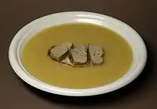 According to a French recipe from the 1800s, a batch of cockchafer soup requires 500 grams of the insect with their legs and wings removed.[2] They are fried in butter, then cooked in a chicken or veal broth. The soup can be strained and eaten as a boullion, or crushed cockchafers can be mixed with egg yolk and roux. The soup was served with slices of veal liver or dove breast[3] and with croutons. A single serving contains approximately 30 beetles.[4][5][6][7]