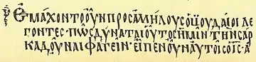 The nomina sacra (special names/words considered sacred in Christianity, abbreviated usually with the first and last letter, and notified with an overline) are employed throughout. The last letter is dependent upon case; the nominative case abbreviations are as follows: ΑΝΟΣ / ανθρωπος (man), ΔΑΔ / δαυιδ (David), ΘΣ / θεος (God), ΙΣ / Ιησους (Jesus), ΙΛΗΜ / ιερουσαλημ (Jerusalem), ΙΗΛ / ισραηλ (Israel), ΚΣ / κυριος (Lord), ΜΗΡ / μητηρ (mother), ΟΥΝΟΣ / ουρανος (heaven), ΟΥΝΙΟΣ / ουρανιος (heavenly), ΠΗΡ / πατηρ (father), ΠΝΑ / πνευμα (spirit), ΠΝΙΚΟΣ / πνευματικος (spiritual), ΣΡΙΑ / σωτηρια (salvation), ΥΣ / υιος (son), ΧΣ / χριστος (Christ/Messiah).[9]:59