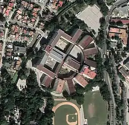 In mid-1923 the construction of this property was started, carried out by the company of architects and engineers Morales y Compañía Arquitectos, being built nine radiating pavilions, a central chapel of three floors, an entrance pavilion that had a fourth level where it was located the observatory. Its inaugural activities were carried out on December 19, 20 and 21, 1925, beginning its first course in January 1926.[4] The result was a monumental pan-optical edifice with an extensive neoclassical façade perpendicular to the large chapel and four large courtyards, recalling the building housing the convent in Havana Vieja, with three stories of porticoed galleries to link nine radial pavilions, the appearance is of instrumentality which is supported both in the design resources and the unusual dimensions of the spaces. The structure is built from the concrete-covered steel structure, the flooring, covered with tiles, and the roof are monolithic reinforced concrete slabs.