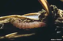 The larvae feed on Juniperus communis. Young caterpillars mine or hollow the needles of their host at the ends of shoots and tie the dead needles together with silk. In fall, it lines the center of the bundle with silk to make a chamber where it spends the winter. In spring, the caterpillar moves to new terminal growth, again binding hollowed needles together with silk.