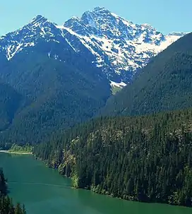 Colonial Peak is a mountain in the North Cascades of Washington, United States. It rises steeply from the southwest bank of Thunder Arm of Diablo Lake, one of the artificial reservoirs on the Skagit River. It is part of a group of peaks that form the northern end of a chain running south through prized climbing destinations such as Eldorado Peak, Forbidden Peak, and Goode Mountain. Colonial Peak takes its name from the Colonial mining claim on its slopes.[4]