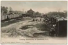 Tobacco was introduced as a crop in Columbus in 1896, and that year a tobacco warehouse was established in Fair Bluff. It remained a marginal crop until 1914, and at the conclusion of World War I overtook cotton as the county's major cash crop.[15] The county's first bank was opened in 1903.[16] Strawberries were introduced at Chadbourn in 1895, and by 1907 Chadbourn had become one of the leading strawberry producers in the world.[17] Another courthouse and jail were built in 1914.[6]