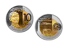 ₱10 | 26.5 mm | 8.7 g | Bi-metallic (Copper nickel outer ring with an aluminum bronze center plug) | Segmented | "Republika ng Pilipinas", Profile of Apolinario Mabini, quill pen | "Talino at Paninindigan" Monument to Apolinario Mabini, signature of Apolinario Mabini, logo of the Bangko Sentral ng Pilipinas, "150 Taon", "1864-2014" | August 20, 2014 |