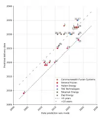 For decades researchers have famously said that fusion power is always 30, or even 50, years away.[45][46] The advent of commercial fusion has changed that, and now fusion power is typically predicted to be around 10 years away, with most companies predicting that the first fusion plant will deliver electricity to the grid before 2035.[47] Although the majority of the companies have only existed for a few years, some have already failed to deliver on their predictions. General Fusion first predicted that it would deliver electricity to the grid by 2009.[48]
