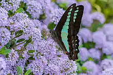 Graphium sarpedon, the common bluebottle or blue triangle in Australia, is a species of swallowtail butterfly that is found in South and Southeast Asia, as well as eastern Australia. There are approximately sixteen subspecies with differing geographical distributions.