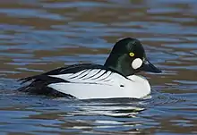 The common goldeneye or simply goldeneye (Bucephala clangula) is a medium-sized sea duck of the genus Bucephala, the goldeneyes. Its closest relative is the similar Barrow's goldeneye.[2] The genus name is derived from the Ancient Greek boukephalos ("bullheaded", from bous, "bull " and kephale, "head"), a reference to the bulbous head shape of the bufflehead. The species name is derived from the Latin clangere ("to resound").[3]