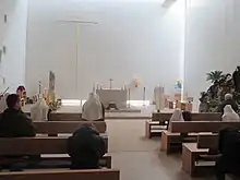 The congregation of the Apostolic sisters of Saint John were created in 1984.[6] It has been recognized a religious congregation of diocesan right by the bishop of Autun, in 1993. They live an apostolic life, through evangelisation, spiritual assistance in dioceses: pension houses, schools, hospitals, prisons etc. Their way of life and charisma is close the one of the brothers, except for priesthood. The general prior is Sister Claire-de-Jésus Salvaige de Lamarge. The mother house and headquarter of the congregation is located in Semur en Brionnais, France. Their habit is composed of a grey tunic and a scapular similar to the black habit of Benedictine, with a rosary to the waist. The apostolic sisters wear a gray veil.