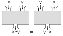 In mathematics, a binary operation is commutative if changing the order of the operands does not change the result. It is a fundamental property of many binary operations, and many mathematical proofs depend on it. Perhaps most familiar as a property of arithmetic, e.g. "3 + 4 = 4 + 3" or "2 × 5 = 5 × 2", the property can also be used in more advanced settings. The name is needed because there are operations, such as division and subtraction, that do not have it (for example, "3 − 5 ≠ 5 − 3"); such operations are not commutative, and so are referred to as noncommutative operations. The idea that simple operations, such as the multiplication and addition of numbers, are commutative was for many years implicitly assumed. Thus, this property was not named until the 19th century, when mathematics started to become formalized.[1][2] A similar property exists for binary relations; a binary relation is said to be symmetric if the relation applies regardless of the order of its operands; for example, equality is symmetric as two equal mathematical objects are equal regardless of their order.[3]
