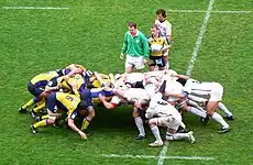 - In rugby union the opposition are awarded a scrum if the player in possession drops the ball forwards or makes the ball go forwards with any part of his body other than his feet and the opposition are unable to gain an advantage from the lost possession. This is called a knock-on.