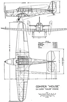 The first flight of the Mouse was at Heston aerodrome on 11 September 1933, piloted by Nick Comper. In February 1934, it was assessed at A&AEE Martlesham Heath, leading to various small design changes.[1][2][3]