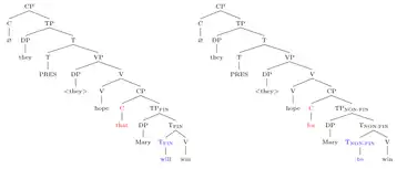 In contrast, the complementizers for, that, as well as the phonologically null complementizer ∅, introduce "declarative or non-interrogative" CPs.[8]