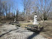 The first of six busts of creative figures in this park section was erected before the completion of the site, and just outside it. The bust of American writer Washington Irving (1871) across East Drive from the Concert Grove,[23] was donated by Demas Barnes.[24] The first inside the grove itself was the bust of Irish poet and lyricist Thomas Moore (1879),[7][25] donated by the St. Patrick Society of Brooklyn.
