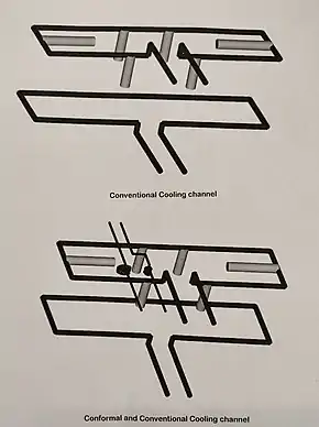 Conformal cooling channel is a cooling passageway which follows the shape or profile of the mould core or cavity to perform rapid uniform cooling process for injection moulding or blow moulding processes.
