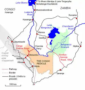 ![]() Map showing the Congo Pedicle road, the direct route from Mufulira to Mansa, and the alternative route via Serenje, Mpika and Kasama, or, from 1983, Serenje and Samfya | |