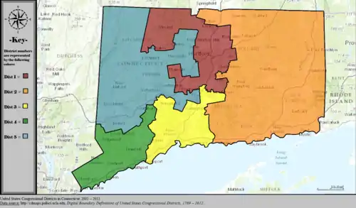 Table of United States congressional district boundary maps in the State of Connecticut, presented chronologically.[4] All redistricting events that took place in Connecticut between 1973 and 2013 are shown.
