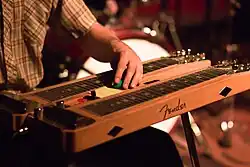 The console steel guitar is any type of electric steel guitar that is built in a frame supported by legs. It may be a lap steel or a pedal steel. Console steel guitars are typically heavier instruments that have multiple necks and/or more than six strings per neck and are therefore not manageable on the player's lap. This type of instrument was created when players in the late 1940s needed to play in different keys and with different chords than the lap steel afforded.[1] To do this, they added additional necks (each tuned differently with additional strings) to a lap steel. The player could then easily switch to a different neck on the same instrument, but this made the instrument so heavy and cumbersome that it could not be easily held on the lap.[2] Trying to solve the problem with multiple necks led to the invention of the pedal steel guitar in the 1950s.[3]