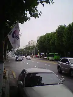 ![]() Street along a road in Seoul during Constitution Day. Flags are hung up along street lights during this day. | |