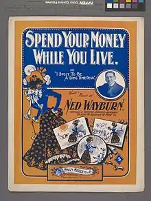 A cover for a collection of sheet music from 1899, showing a woman dressed in luxurious clothes spending money in multiple scenarios