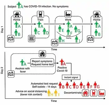 - ↑ Ferretti L, Wymant C, Kendall M, Zhao L, Nurtay A, Abeler-Dörner L, et al. (May 2020). "Quantifying SARS-CoV-2 transmission suggests epidemic control with digital contact tracing". Science. 368 (6491): eabb6936. doi:10.1126/science.abb6936. PMC 7164555. PMID 32234805.