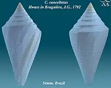 - 1 2 Conus cancellatus Hwass in Bruguière, 1792. Retrieved through: World Register of Marine Species on 27 March 2010.