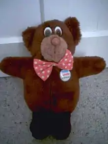 Cookie Bear's immediate popularity resulted in an increase in his use as a mascot for Hudson's biscuits, with eventual heavy use of his image in advertisements, on packaging and on a growing number of promotional items.[2] Cookie Bear became particularly associated with Chocolate Chippies, a hard round biscuit with chocolate chips.[3] At the height of Cookie Bear's popularity in 1975, John Berry wrote and published an illustrated children's book called The Adventures of Cookie Bear.[4]