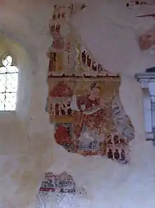 The church is most noted[4] for its extensive wall paintings. Most of the surviving designs date from the 12th century — the oldest were produced in about 1135 — but some are more recent.[2][4] They were discovered in 1949 and preserved with minimal restoration, unlike many similar examples elsewhere.[2][5] Designs include The Visitation, the Nativity of Jesus, Christ in Majesty and Christ delivering the Keys of Heaven to Saint Peter and the Book to Saint Paul.[1][5][7] On the soffit beneath the chancel arch is a humorous sketch: a man with a gaping mouth grimaces as he strains to hold up the arch.[1][4][7]