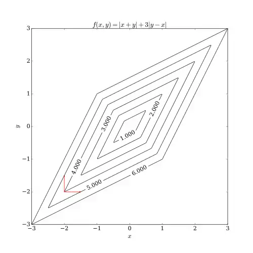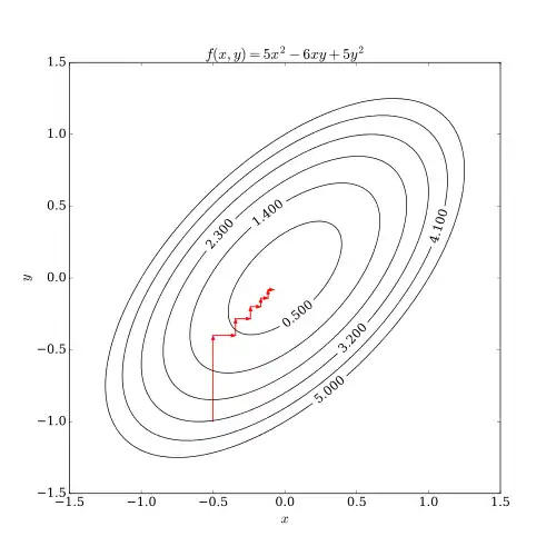 Coordinate descent has two problems. One of them is having a non-smooth multivariable function. The following picture shows that coordinate descent iteration may get stuck at a non-stationary point if the level curves of a function are not smooth. Suppose that the algorithm is at the point (-2, -2); then there are two axis-aligned directions it can consider for taking a step, indicated by the red arrows. However, every step along these two directions will increase the objective function's value (assuming a minimization problem), so the algorithm will not take any step, even though both steps together would bring the algorithm closer to the optimum. While this example shows that coordinate descent is not necessarily convergent to the optimum, it is possible to show formal convergence under reasonable conditions.[3]