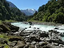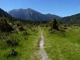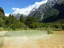 The Copland Track is a tramping track in the south Westland area of New Zealand's South Island, well known for the naturally-occurring hot springs at Welcome Flat along its route. The main track is approximately 25 kilometres (16 mi) long one-way from the trailhead at State Highway 6 to the track's inland end at the Douglas Rock Hut, and is usually completed in 2 to 4 days depending on whether the full distance is walked, with many opting to walk only as far as Welcome Flat. The track is the western portion of a longer path which historically connected the West Coast to Mount Cook Village via Copland Pass, however erosion and the retreat of the Hooker Glacier has led to the eastern side of this route becoming increasingly dangerous to traverse.[4]