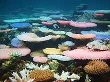 Large coral colonies such as Porites are able to withstand extreme temperature shocks, while fragile branching corals such Acropora are far more susceptible to stress following a temperature change.[56] Corals consistently exposed to low-stress levels may be more resistant to bleaching.[57][58]