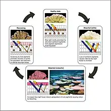 Certain mild bleaching events can cause coral to produce high concentrations of sun-screening pigments in order to shield themselves from further stress.[21] Some of the pigments produced have pink, blue or purple hues, while others are strongly fluorescent. Production of these pigments by shallow-water corals is stimulated by blue light.[126] When corals bleach, blue light inside the coral tissue increases greatly because it is no longer being absorbed by the photosynthetic pigments found inside the symbiotic algae, and is instead reflected by the white coral skeleton.[127] This causes an increase in the production of the sun-screening pigments, making the bleached corals appear very colourful instead of white – a phenomenon sometimes called 'colourful coral bleaching'.[21]