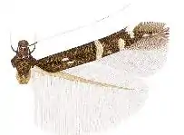 Male. Forewing length 3.5 mm. Head: frons shining greyish white with greenish and reddish reflections, vertex and neck tufts shining bronze brown with greenish and reddish reflections, laterally and medially lined white, collar shining bronze brown with greenish and reddish reflections; labial palpus, first segment very short, white, second segment three-quarters of the length of third, dark brown with white longitudinal lines laterally and ventrally, third segment white, brown lined laterally; scape dorsally dark brown with a white anterior line, ventrally white; antenna missing. Thorax and tegulae shining dark brown with reddish gloss, thorax with a white median line in posterior half. Legs: shining dark brown, femora shining greyish brown, foreleg with a white line on tibia and tarsal segments one, two, four and five, tibiae of midleg and hindleg with a silver metallic longitudinal line with strong bluish reflection from base to one-third, tibia of midleg with an oblique white medial streak and white apical ring, tibia of hindleg as midleg but with an additional broad white subapical ring, tarsal segments of midleg with white apical rings on segments one, two, four and five, segments one and two also with a thin white longitudinal line laterally on outside, tarsal segments of hindleg with white apical rings on segments one, two and four, segment five entirely white, spurs dark brown, paler towards apex. Forewing shining dark brown with reddish gloss, at one-fifth two very short silver streaks, a medial just above fold, a subdorsal below fold and further from base than the medial, a broad tubercular silver metallic fascia at one-half, perpendicular on dorsum and with purplish reflection, on dorsum at three-fifths, a tubercular silver metallic spot with purplish reflection, between the fascia and the dorsal spot a few yellow scales above dorsum, a tubercular silver metallic subcostal spot at three-quarters, outwardly edged by a narrow white costal streak, apical line as a short silver metallic streak with strong bluish reflection in middle of the apical area and a shining white spot in the cilia at apex, cilia dark brown, paler on dorsum towards base. Hindwing shining greyish brown, cilia greyish brown. Underside: forewing shining greyish brown with reddish gloss and with the white costal streak and apical line distinctly visible, hindwing greyish brown, a short whitish streak on dorsum at base. Abdomen too greased to describe.[1]