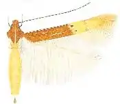 Male, female. Forewing length 2.4 mm. Head: frons shining white with greenish and reddish reflections, vertex and neck tufts shining olive brown with reddish gloss, medially and lined white laterally, collar shining olive brown; labial palpus first segment very short, white, second segment three-quarters of the length of third, dark brown with white longitudinal lines laterally and ventrally, third segment white, lined brown laterally; scape dorsally shining dark brown with a white anterior line, ventrally shining white, antenna shining dark brown, a white line from base to three-fifths, followed by two white rings on two segments separated by two dark brown segments, followed towards apex by six dark brown segments, two white and five dark brown segments at apex. Thorax and tegulae shining olive brown with reddish gloss, thorax with a white median line. Legs: shining ochreous-grey, foreleg with a white line on tibia and tarsal segments one to three and five, segment four with a white apical ring, tibia of midleg with white oblique basal and medial lines and a white apical ring, tarsal segments one and two with white apical spots, segment five entirely white, tibia of hindleg with a very oblique white line from base to two-thirds and a white apical ring, tarsal segments with indistinct whitish apical rings, spurs white dorsally, ochreous ventrally. Forewing shining olive brown with reddish gloss, four narrow white lines in the basal area, a costal from base to the transverse fascia, a short medial above fold, from one-quarter to one third, a subdorsal from one-third to one-half, a dorsal from base to one-third, the costal edged brown, other lines sometimes edged by a few brown scales, a pale yellow transverse fascia beyond the middle, prolonged towards apex, dividing the forewing in an olive brown basal area and a pale yellow apical area, bordered at inner edge by two tubercular pale golden metallic subcostal and subdorsal spots, both spots of similar size and with an outward patch of blackish scales, the subdorsal slightly further from base than the subcostal, in the middle of the pale yellow section a small tubercular pale golden costal and dorsal spot of similar size opposite, apical line absent, cilia ochreous around apex, yellowish white towards dorsum. Hindwing shining very pale grey, cilia yellowish white. Underside: forewing shining pale greyish brown in the basal half, pale yellow in the apical half, hindwing shining very pale grey. Abdomen dorsally shining pale yellow, ventrally shining ochreous, anal tuft shining white.[1]