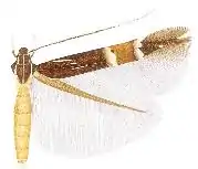 Male. Forewing length 3.3 mm. Head: frons shining grey with greenish and reddish reflections, vertex shining bronze brown, neck tufts shining dark bronze brown with reddish reflection, laterally and medially lined white, collar shining dark bronze brown; labial palpus first segment very short, white, second segment four-fifths of the length of third, dark brown with white longitudinal lines laterally and ventrally, third segment white, lined dark brown laterally; scape dorsally shining dark brown with white anterior and dorsal lines, ventrally shining white, antenna shining dark brown with a short white line from base changing to an interrupted line to beyond one-half, remaining part of antenna missing. Thorax and tegulae shining bronze brown with reddish gloss, thorax with a white median line, tegulae narrowly lined white inwardly. Legs: shining greyish brown, femora of hindleg ochreous-grey, foreleg with a white line on tibia and tarsal segments, except segment four, midlegs missing, tibia of hindleg with white oblique basal and medial lines and a white apical ring, tarsal segments one and two with white apical rings, segment five dorsally white, spurs white, ventrally greyish brown. Forewing shining dark bronze brown with reddish gloss, three white lines of about equal length in the basal area, a subcostal from one-tenth to one fifth, bending from costa distally, a medial above fold, its centre under the distal end of the subcostal, a subdorsal slightly further from base than the medial, a few white scales on dorsum beyond base, a yellowish brown transverse fascia beyond the middle, only slightly paler than the ground colour of the forewing, bordered at the inner edge by a tubercular pale golden metallic fascia, slightly narrowing at costa and with a subcostal patch of blackish brown scales on outside, bordered at the outer edge by two tubercular pale golden metallic costal and dorsal spots, the dorsal spot a little larger and slightly more towards base, both spots very close to each other or connected in the middle, forming a fascia, a small white costal streak connected to the costal spot, the apical line as a pale golden spot in the middle on dorsum of the apical area and a white streak in the cilia at apex, cilia bronze brown at apex, paler towards dorsum. Hindwing shining greyish brown, cilia pale brown. Underside: forewing shining greyish brown, the white costal and apical streak distinctly visible, hindwing shining brownish grey. Abdomen dorsally yellowish brown, ventrally brownish grey, segments banded shining white posteriorly, anal tuft yellowish white.[1]