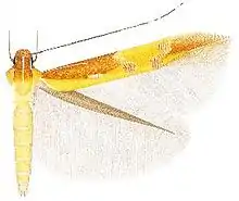 Male, female. Forewing length 4.5-4.8 mm. Head: frons shining pale ochreous-grey with greenish and reddish reflections, vertex and neck tufts shining bronze brown with reddish gloss, laterally and medially lined white, collar shining bronze brown; labial palpus first segment very short, white, second segment four-fifths of the length of third, dark brown with white longitudinal lines laterally and ventrally, third segment white, lined dark brown laterally; scape dorsally dark brown with white anterior and dorsal lines, ventrally white, antenna shining dark brown, a white line at base, changing into an interrupted line to beyond one-half, followed towards apex by an annulated part of about ten segments, six dark brown, four white, two dark brown, two white, nine dark brown, four white and three dark brown segments at apex. Thorax and tegulae shining yellowish brown with reddish gloss, thorax posteriorly yellowish and with a white median line, tegulae very narrowly lined white inwardly. Legs: shining dark olive brown with reddish gloss, femora pale ochreous, foreleg with a white line on tibia and tarsal segments one to three and five, tibia of midleg with white narrow oblique basal and medial streaks and a white apical ring, tarsal segments one to three with ochreous-white apical rings, segment five entirely ochreous-white, tibia of hindleg as midleg, but with an additional subapical oblique white streak, tarsal segment one with ochreous subbasal and apical rings, remaining segments with ochreous apical rings, spurs shining white dorsally, ochreous-grey ventrally. Forewing shining bronze brown with reddish gloss, the basal area, below fold, to transverse fascia pale yellow, two white lines in the basal area, a narrow subcostal to one-quarter, slightly bending from costa, a broad and short yellowish white dorsal at base, a silver metallic tubercular spot with pinkish reflection at one-quarter just below fold, a pale yellow transverse fascia beyond the middle, narrowing towards dorsum and slightly darkened in the middle, bordered at the inner edge by two pale golden metallic subcostal and subdorsal spots with reddish and purple reflections, neither spot reaching costa nor dorsum, thus forming an inward oblique fascia, bordered at the outer edge by a broad outwardly oblique fascia, narrowed in the middle, beyond the outer metallic fascia pale yellow streaks on the costal and dorsal sides, the dorsal streak much longer than the costal, a narrow and indistinct whitish apical line from the dorsal pale yellow streak to apex, cilia bronze brown around apex, ochreous-grey towards dorsum. Hindwing shining grey with greenish and reddish gloss, cilia ochreous-grey. Underside: forewing shining greyish brown, hindwing shining greyish-brown in costal half, pale grey in dorsal half. Abdomen dorsally shining pale yellow, segments banded shining greyish white posteriorly, ventrally shining yellowish white, anal tuft whitish dorsally, grey ventrally, in the female abdomen is segment seven brownish grey and the anal tuft yellowish white.[1]