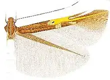 Male. Forewing length 4.8 mm. Head: frons shining ochreous-white with greenish and reddish reflections, vertex shining olive brown with greenish and reddish reflections, neck tufts and collar olive brown with reddish reflection; labial palpus first segment very short, white, second segment three-quarters of the length of third, dark brown with white longitudinal lines laterally and ventrally, third segment white, brown lined laterally; scape dark brown with a white anterior line, white ventrally, antenna shining dark brown with a white line from base to one-half, in middle interrupted, followed towards apex by fourteen dark brown segments, eleven white, eleven dark brown and five white segments at apex. Thorax and tegulae shining olive brown with greenish and reddish gloss, thorax with a white median line, tegulae lined white inwardly. Legs: shining olive brown, foreleg and midleg dark brown dorsally, femora of midleg and hindleg shining ochreous, foreleg with a white line on tibia and tarsal segments one, two and segment three in basal half, segment five entirely white, tibia of midleg with an oblique narrow white basal line, a white medial spot and a white apical ring, tarsal segment one with a lateral white line and a white apical ring, segment two with a white dorsal line in the distal half and segment five entirely white, tibia of hindleg as midleg, but with an additional ochreous subapical ring and blackish-brown hair pencils before and after the medial line, tarsal segments one to three dark greyish brown, segment four dorsally white and segment five entirely white, spurs ochreous-white dorsally, dark grey ventrally. Forewing shining greyish brown with reddish gloss, costal half from base towards transverse fascia and below fold olive brown, four very narrow white lines with greenish reflection in the basal area, a subcostal from base to one-third, bending from costa in distal third, a medial above fold, almost from base to just before the end of the subcostal, an oblique and very short subdorsal from one-third, a short dorsal from beyond base to one-fifth, a yellow transverse fascia in the middle, greyish brown in dorsal half, with a long apical protrusion in the middle and extending as an apical line into the apical cilia, bordered at the inner edge by two tubercular very pale golden metallic subcostal and dorsal spots with greenish reflection, the subcostal spot much more towards base and with patch of blackish scales on outside, bordered at the outer edge by two similar coloured longitudinal costal and dorsal spots, both spots opposite, the outer costal spot lined brown inwardly, a long white costal streak beyond the outer costal spot, cilia olive brown, greyish brown towards dorsum. Hindwing shining brownish grey with some reddish gloss, cilia greyish brown. Underside: forewing shining greyish brown, the white costal streak and the yellow apical line distinctly visible, hindwing shining greyish brown.[1]