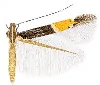 Male. Forewing length 3.7 4.2 mm. Head: frons shining greyish white, vertex and neck tufts shining dark bronze brown, laterally and medially lined white, collar shining dark bronze brown; labial palpus first segment very short, white, second segment four-fifths of the length of third, dark brown with white longitudinal lines laterally and ventrally, third segment white, lined brown laterally; scape dorsally shining dark brown with a white anterior line, ventrally shining white, antenna shining dark brown with a white line from base to three-fifths, interrupted distally, followed towards apex by two white segments, two dark brown, two white, ten dark brown and seven white segments at apex. Thorax shining dark brown, tegulae bronze brown, thorax with a white median line, tegulae lined white inwardly. Legs: shining dark brown, femora of midleg and hindleg shining golden grey, foreleg with a white line on tibia and tarsal segments, but interrupted on segment three, tibia of midleg with a white oblique basal streak and white medial and apical rings, tibia of hindleg as midleg but with an additional subapical white ring, tarsal segments of midleg with white apical rings on segments one, two and four, segment five entirely white, tarsal segments of hindleg with white apical rings on segments one to three, segments four and five entirely white, spurs white dorsally, brownish ventrally. Forewing shining dark brown with reddish gloss, five narrow white lines in the basal area, a short costal just before the transverse fascia, a subcostal from base to one-third, gradually bending from costa, a short medial above fold from one-quarter to just beyond the subcostal, a subdorsal about as long as the medial, but slightly further from base, a dorsal from base to one-quarter, a bright yellowish orange transverse fascia beyond the middle, narrowing towards dorsum and with a long and narrow apical protrusion, bordered at the inner edge by a slightly outward oblique tubercular pale golden metallic fascia with a small subcostal patch of blackish scales on the outside, bordered at the outer edge by two tubercular pale golden metallic costal and dorsal spots, the dorsal spot slightly larger than the costal and more towards base, both spots with a dark brown inward lining, the costal spot outwardly edged by a white costal streak, a narrow white apical line from the apical protrusion, cilia dark brown, paler towards dorsum. Hindwing shining dark brownish grey, cilia greyish brown. Underside: forewing shining dark greyish brown, the white apical line distinctly visible, hindwing shining dark greyish brown. Abdomen dorsally ochreous, laterally shining pale golden, ventrally shining white, anal tuft yellowish white.[1]