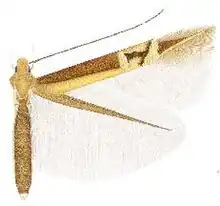 Male, female. Forewing length 4.8 mm. Head: frons shining ochreous with greenish and reddish reflections, vertex, neck tufts and collar shining pale bronze brown with strong golden gloss and greenish reflection; labial palpus, first segment very short, white, second segment three-quarters of the length of third, grey with white longitudinal lines laterally and ventrally, third segment white, lined dark greyish brown laterally; scape dark bronze brown with a white anterior line, ventrally white, antenna dark bronze brown, beyond two-thirds a white ring of two segments, followed towards apex by fourteen dark bronze brown and five white segments at apex. Thorax and tegulae shining pale bronze brown with strong golden gloss and greenish reflection. Legs: dark grey, foreleg with a white line on tibia and tarsal segments one, two and five, segment three white in basal half, tibia of midleg with an oblique indistinct white dorsal line in the basal half and a white apical ring, tarsal segment one dorsally whitish, segment five entirely white, tibia of hindleg with white oblique basal and medial lines and a white apical ring, tarsal segment one dorsally whitish and with a white apical ring, segment two with a white apical ring, segment five entirely white, spurs white dorsally, dark grey ventrally. Forewing above fold and in the apical area shining bronze brown with a strong reddish golden gloss, below fold shining pale golden with greenish and reddish reflections, a pale yellow transverse fascia beyond the middle, narrowing towards dorsum, bordered at the inner edge by a pale golden metallic fascia, perpendicular at dorsum, bordered at the outer edge by a broad, slightly outward oblique similarly coloured fascia, widest on dorsum, both fasciae with some pale reddish reflection, in the middle of the transverse fascia a broad blackish-brown streak with strong reddish gloss, the inner fascia with some irregular dark grey or blackish brown lining on the outside, the outer fascia lined blackish brown on the inside, the outer fascia costally edged by a short and narrow white costal streak, the apical line as a pale golden metallic streak on dorsum of the apical area and ending just before apex, cilia bronze brown around apex, paler towards base, hindwing brownish grey with greenish gloss, cilia greyish brown. Underside: forewing shining greyish brown, hindwing brownish grey. Abdomen shining brown, laterally shining grey with greenish reflection, ventrally yellowish white, anal tuft whitish, mixed grey.[1]