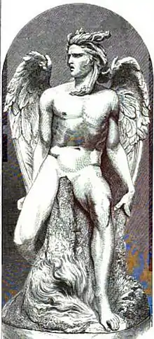 Lucifer was reviewed by Francesco dall' Ongaro at rhapsodic length as a worthy representation of the Satanic ideal shared in the literary works of John Milton or Lord Byron. Dall' Ongaro found the figure "androgynous," in keeping with the theological view that gender came into existence only with the creation of human beings and was not a characteristic of angels.[4] The sculpture received notice for its "extraordinary vigor."[5]