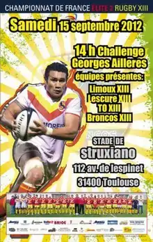 Originally called Challenge Georges-Aillères, it started as an invitational preseason tournament hosted by Toulouse XIII Broncos at their home venue Stade Philippe-Struxiano.[2] It was named after retired player Georges Aillères, who played most of his career for Toulouse area rugby league and rugby union clubs.[1] The original format was a single-day round robin consisting of abridged 30-minute games.[2] Toulouse's two main teams, the home side Broncos (Elite 2) and the Olympique (Elite 1), were mainstays while the two remaining spots were filled on a year-to-year basis.[2] The Broncos won the 2012 edition, the earliest on record, losing to fellow Elite 2 members Lescure d'Albigeois, but beating both Elite 1 participants Toulouse Olympique and Limoux.[3]