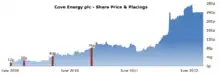 Cove was listed on the Alternative Investment Market of the London Stock Exchange. Over a period of seventeen months, between June 2009 and November 2010, the company raised a total of £182 million through four placings. Each placing was done at a significant higher market capitalisation than the previous one: