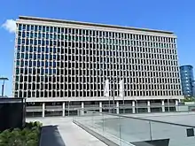 In 1878, the Crédit Communal established its head office at the corner of rue de Ligne and rue de la Banque in central Brussels, next to the then newly finished building of the National Bank of Belgium. That building was eventually demolished and replaced in the 1970s by a complex designed by prominent architect Marcel Lambrichs, presenting a neoclassical stone-faced front towards the National Bank and modern curtain-wall façades on the other sides.[4][5]